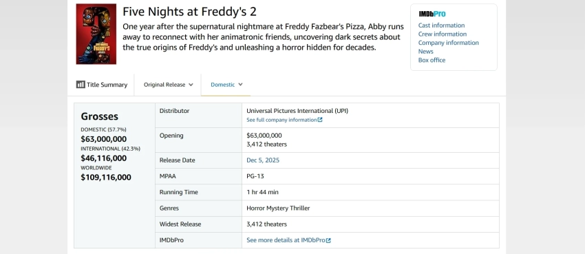 Хоррор «Пять ночей с Фредди 2» уже окупился, но на старте собрал меньше первого фильма