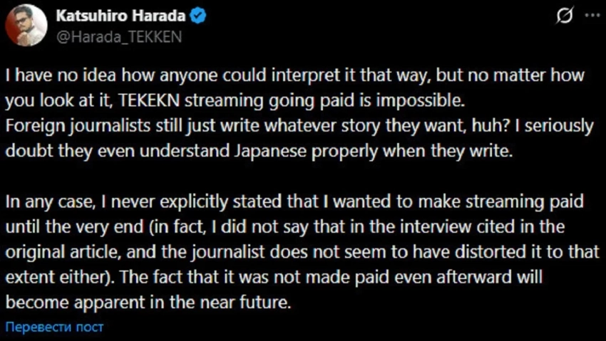 «Я понятия не имею, как кто-то мог так интерпретировать, но, как ни посмотри, платные трансляции Tekken невозможны. Иностранные журналисты по-прежнему пишут всё, что хотят, не так ли? Я серьезно сомневаюсь, что они вообще понимают японский», — разгневался Харада.