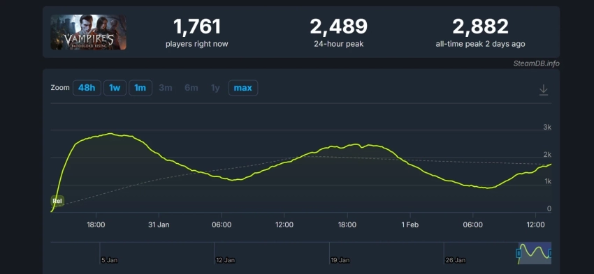 Пиковый онлайн Vampires: Bloodlord Rising в Steam превысил 2,8 тыс. человек. Это третий по количеству игроков результат издателя Toplitz Productions. Впереди идут лишь исторические выживалки Medieval Dynasty (31 тыс. игроков на пике) и Sengoku Dynasty (9,1 тыс.)