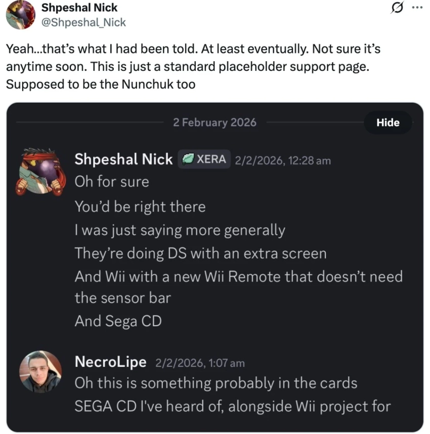Хотя Nintendo пока не раскрыла сроки запуска, источники утверждают, что Wii может получить поддержку обновлённого Wii Remote без сенсорной панели, DS — дополнительный экран, а Sega CD — стандартную эмуляцию, аналогичную другим консолям Sega.