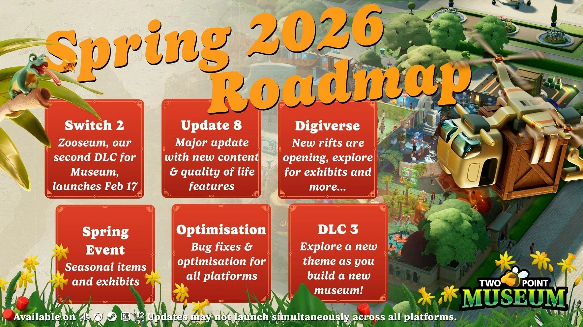 Обложка: игра Two Point MuseumTwo Point Studios поделилась дорожной картой Two Point Museum с планом обновлений на эту весну. Всё это ожидается в ближайшие 3-4 месяца, «примерно» в представленном порядке.