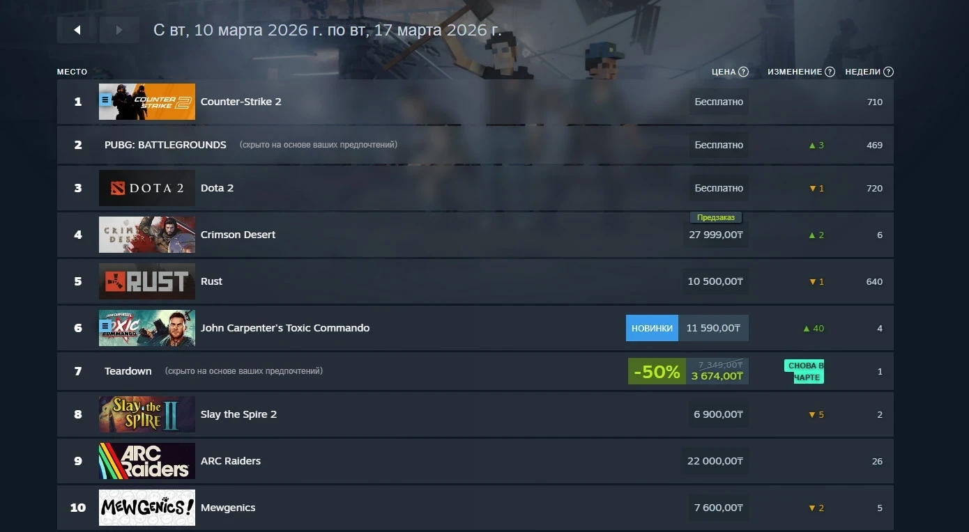 Единственной новинкой недели в российском сегменте Steam стал шутер John Carpenterʼs Toxic Commando, занявший шестое место. Показателями выше может похвастаться Crimson Desert на четвёртой строчке. При этом в чарт вернулась Teardown на фоне выхода обновления с мультиплеером.