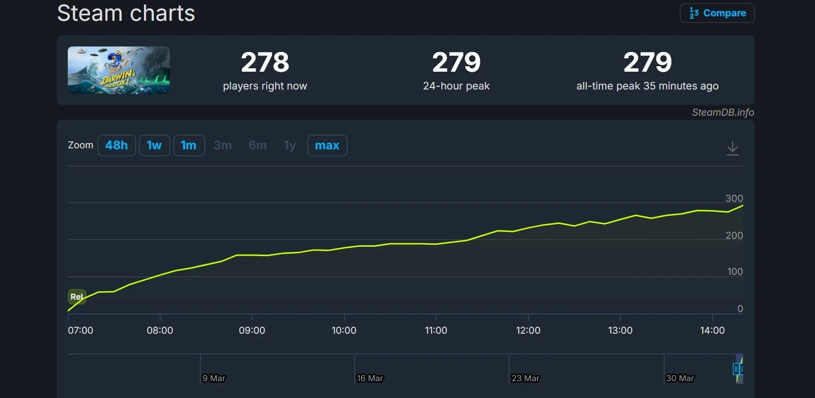 Увы, Darwin’s Paradox! не смогла привлечь большое количество игроков в Steam. Пиковый онлайн новинки составил 279 человек, хотя число ещё может вырасти в ближайшие часы или на выходных.